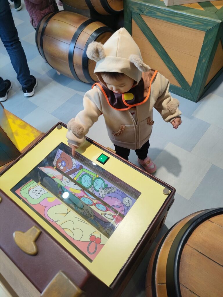 今回、1階と2階それぞれのエリアに行きましたが、まだ歩けない月齢である7か月の長男は、見る・聞くなど受動的な楽しみがメインでした。