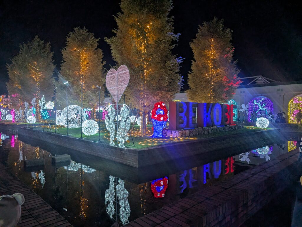 入り口をくぐると池の中央には「BE KOBE」のモニュメントがあり、その周りの木にはイルミネーションが飾られています。