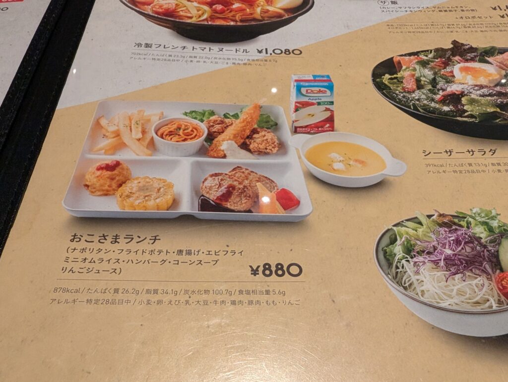 メニュー表を見たところ、アレルギー対応のメニューはありませんでした。しかし、メニュー表にアレルギー表示の記載があるのでそちらで確認することができます。